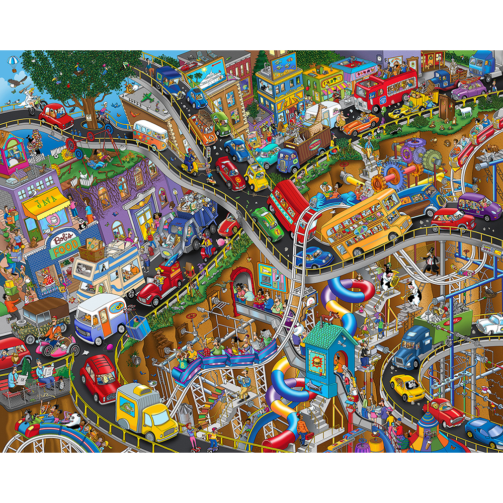 Shift gears and putter along in piecing together a wacky rush hour. In Steve Skelton's artwork, everyone is getting away a runaway bride, Martian, and, hey, who let the dogs out? Each perfect fit will add vibrant color and more absurdity to the scene.