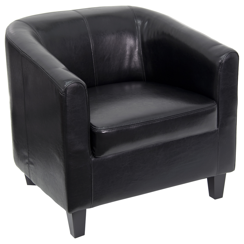 - Transitional design with sloping arms and barrel back