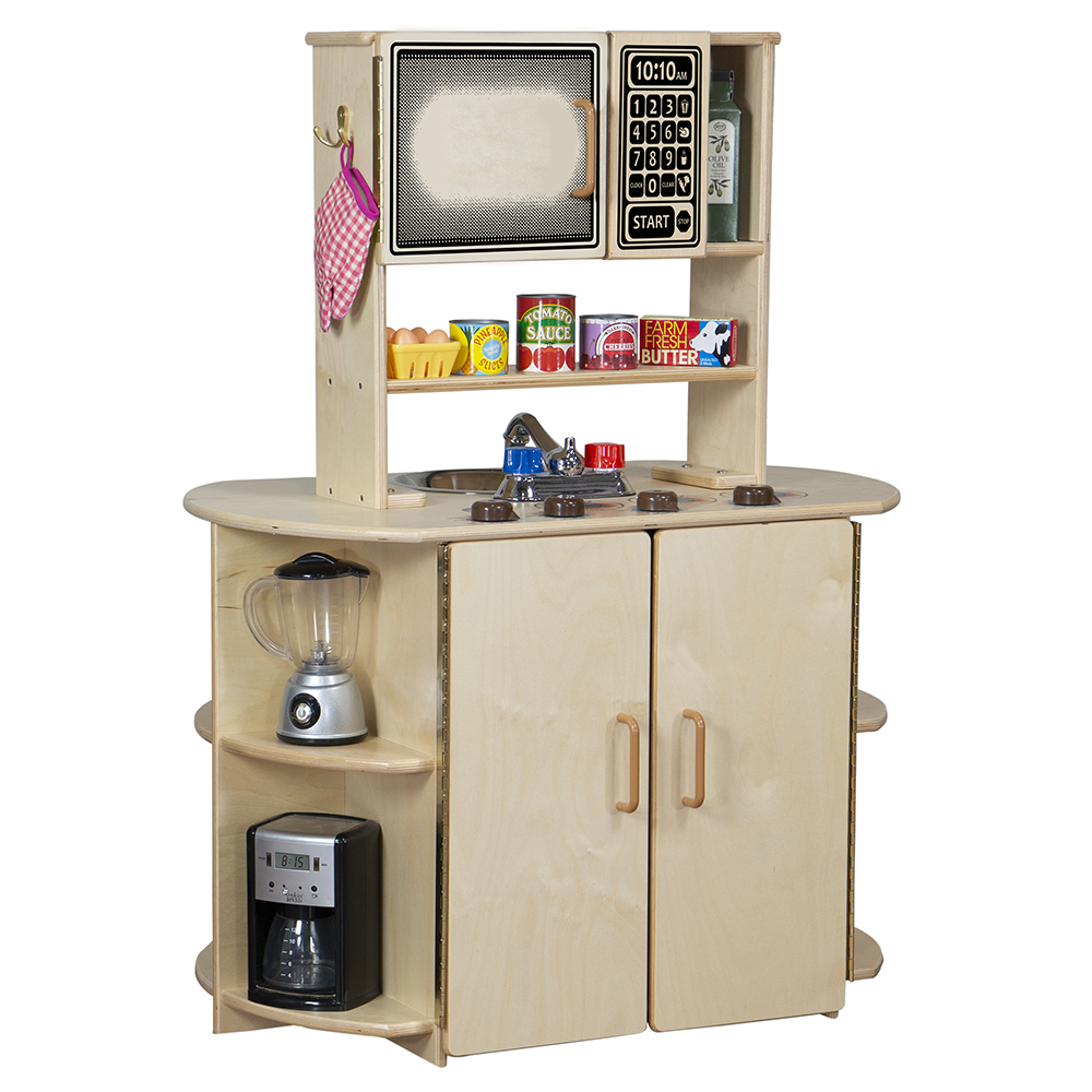 All your basic kitchen needs and spacious storage are found in this one unit. Features durable plastic handles, burners, microwave, and a durable plastic sink pan. A recessed back for added strength, stability, and beauty.